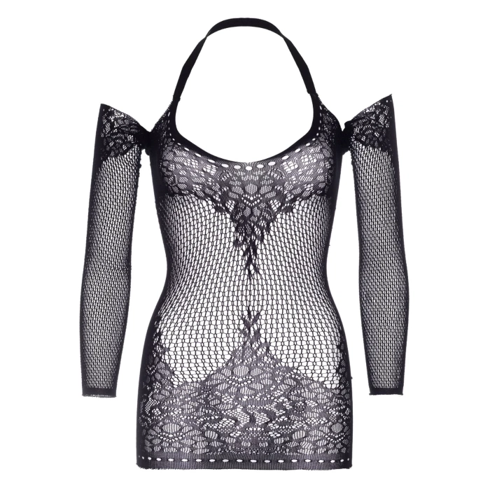 Bezešvé minišaty s dlouhým rukávem a krajkou z síťoviny, zapínáním na klíčovou dírku a lemováním na očka od prestižní značky spodního prádla Leg Avenue. Zvyšte svou ženskost pořízením exkluzivního kousku svůdnosti, smyslnosti a elegance.