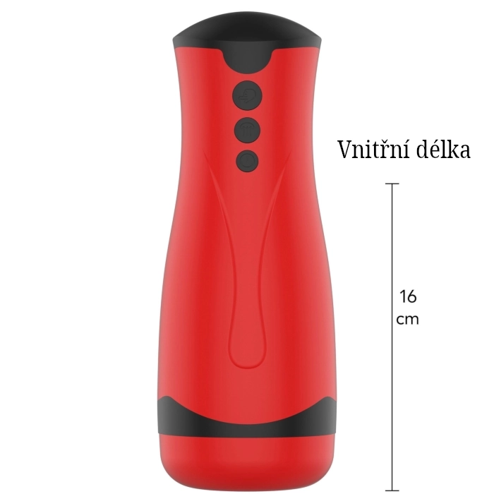 Parametry: Barva: červená, Materiál: TPE silikon, ABS, Rozměry: celková délka 26 cm, celková šířka 9 cm, použitelná délka masturbátoru 16 cm, průměr roztažitelný od 3 cm, Vibrace: ano, Pohon: nabíjecí Lithium-iontová baterie, Doba nabíjení: 3 hodiny, Voděodolnost: Ano, pouze vložka, Obal proti stříkající vodě IPX4, celková váha: 750 g, Lubrikace: pouze gely na vodní bázi
