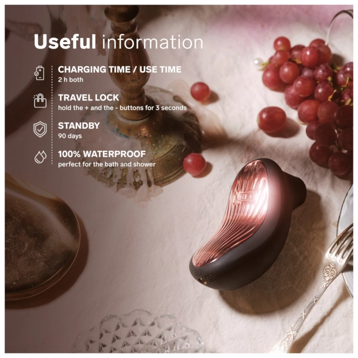 vodotěsné provedení pro nekončící orgasmy, dárková krabička obsahuje obal na vibrátor a vzorek lubrikantu